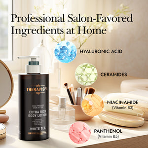 Nourish your skin with Extra Rich Body Lotion, infused with cold-pressed shea butter, ceramides, niacinamide, and hyaluronic acid for deep hydration and protection.