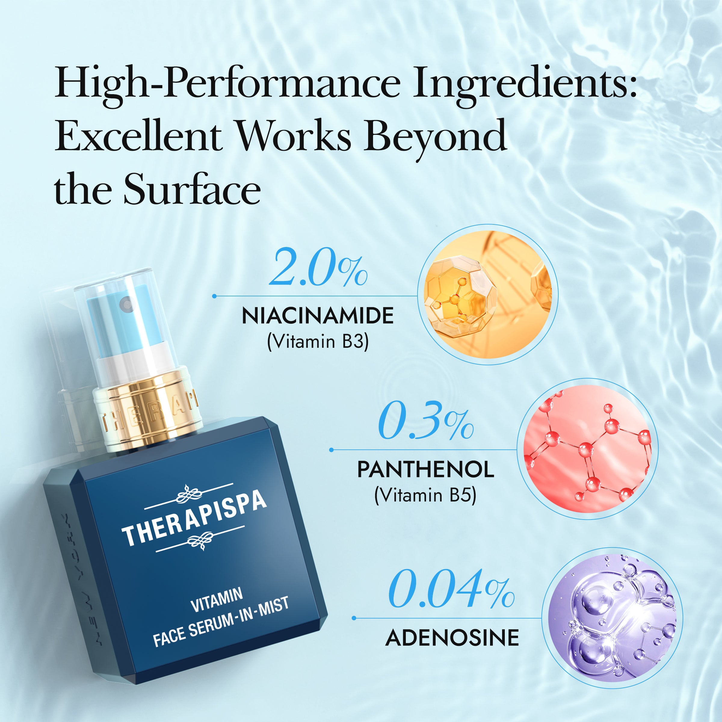 • Hydration and Vitality: Powered by a blend of hyaluronic acid, niacinamide, panthenol, and adenosine, this mist delivers essential nutrients that deeply hydrate, rejuvenate, and shield your skin against daily stressors.